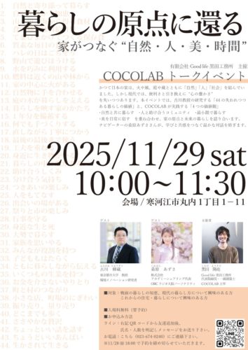 今回のトークイベントでは、東京都市大学の 古川柳蔵教授 と、グッドライフ黒田工務所代表 黒田陽亮 が、「44の失われつつある暮らしの価値」と「4つの暮らしの価値観」