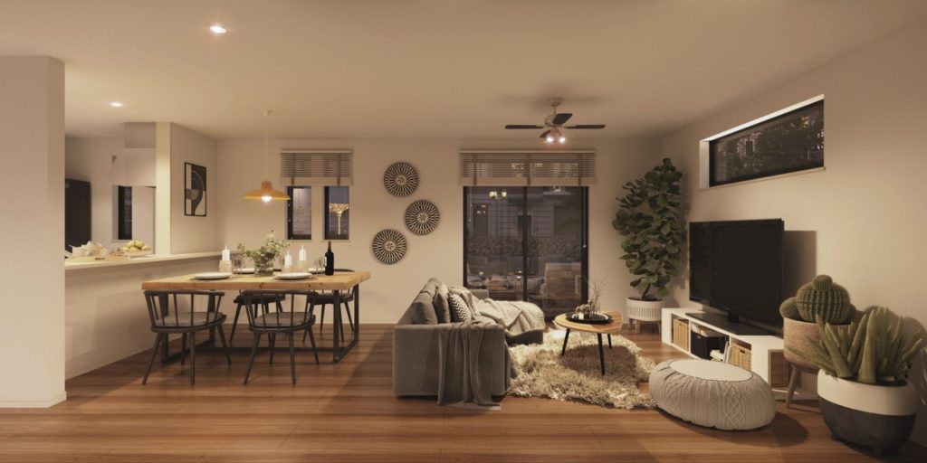 住み心地の良いモダンな平屋、明るいリビングに家族が集まる。